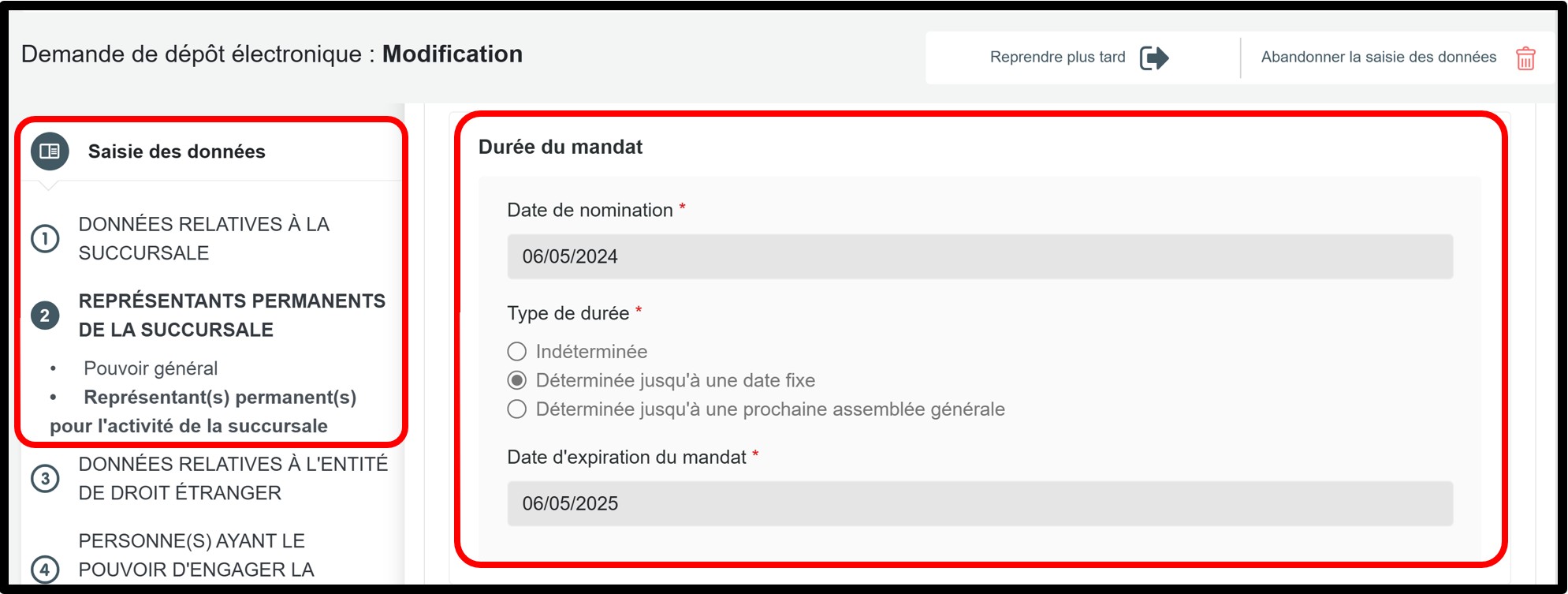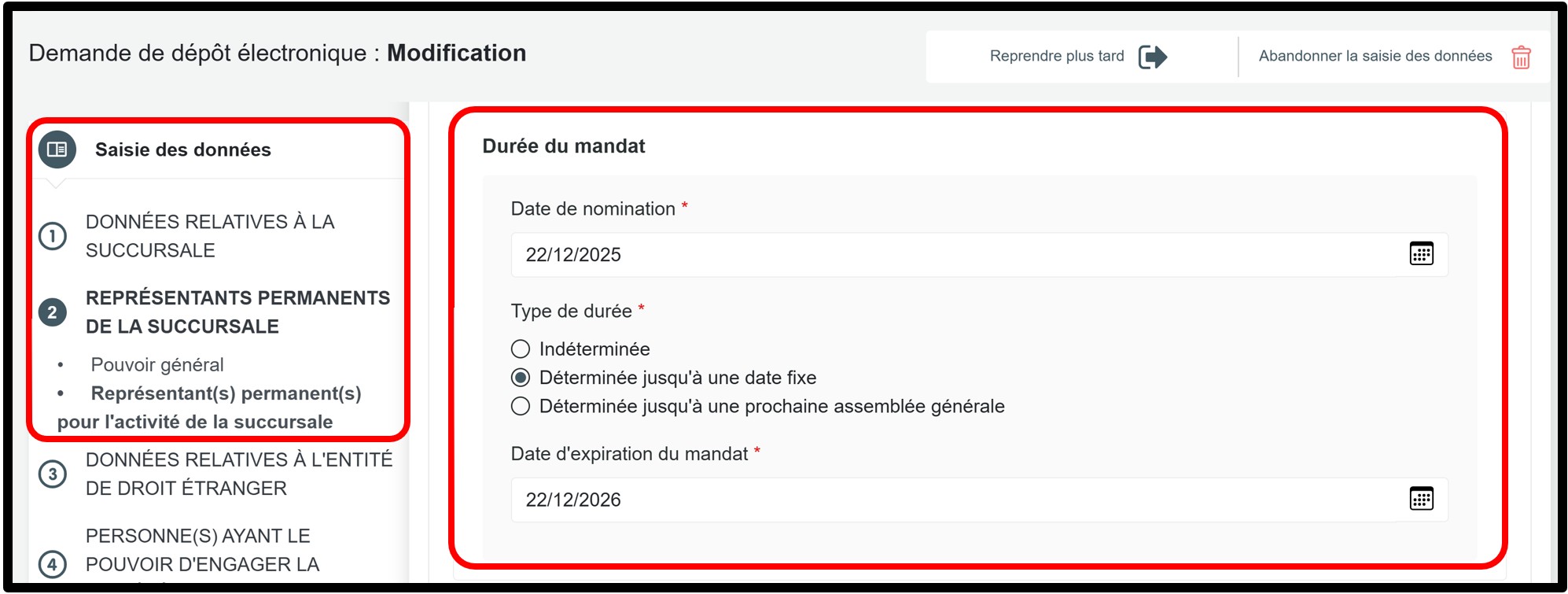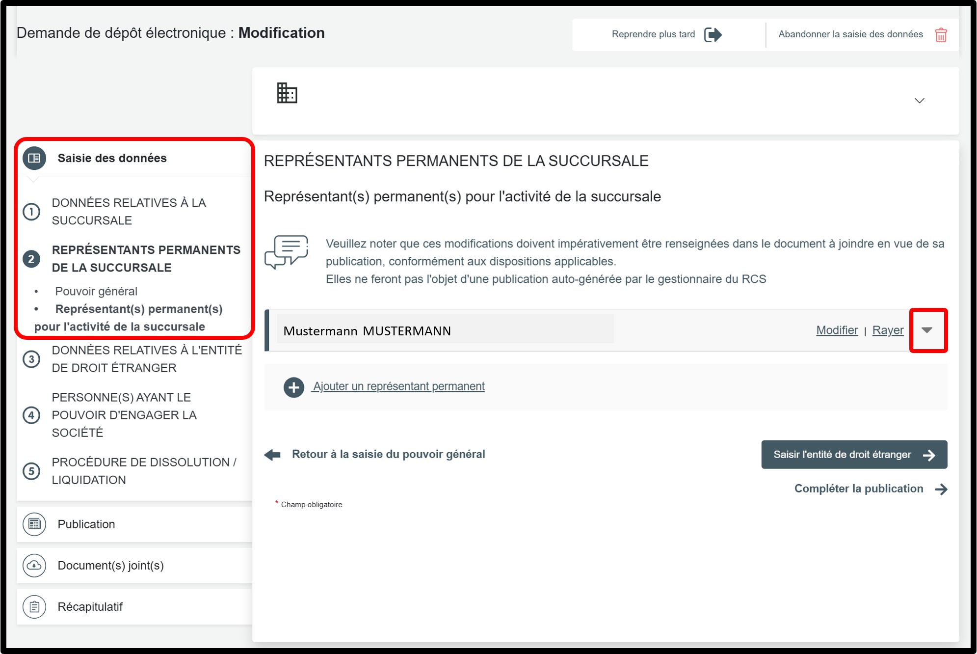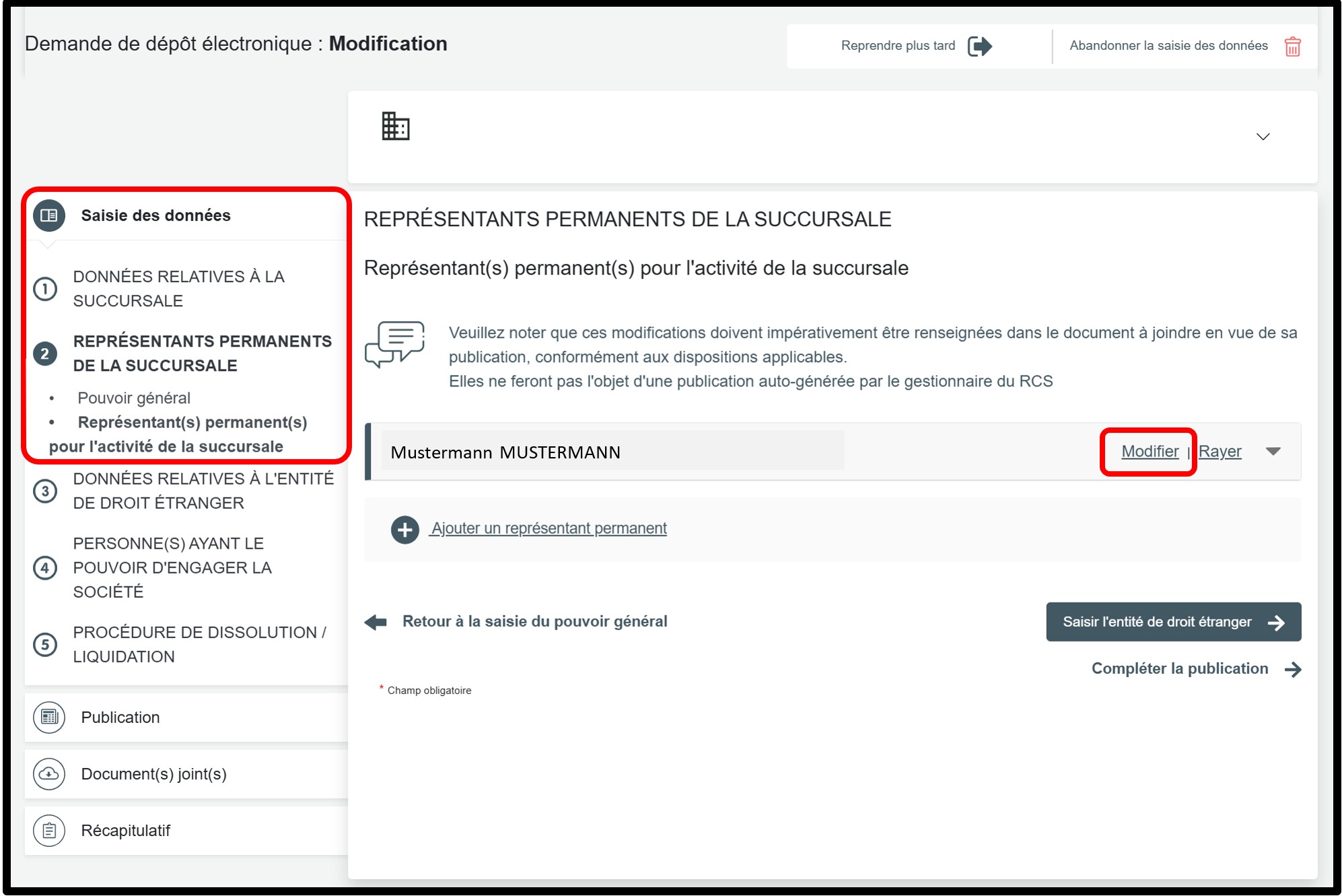 Dans la partie Saisie des données, sélectionnez la rubrique Représentants permanents de la succursale pour accéder aux informations à modifier.