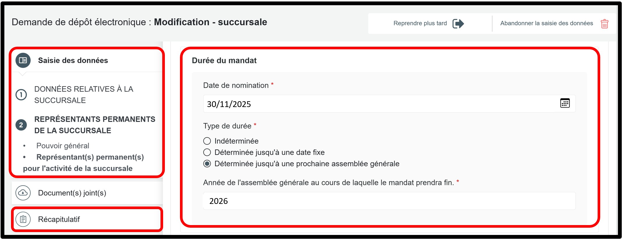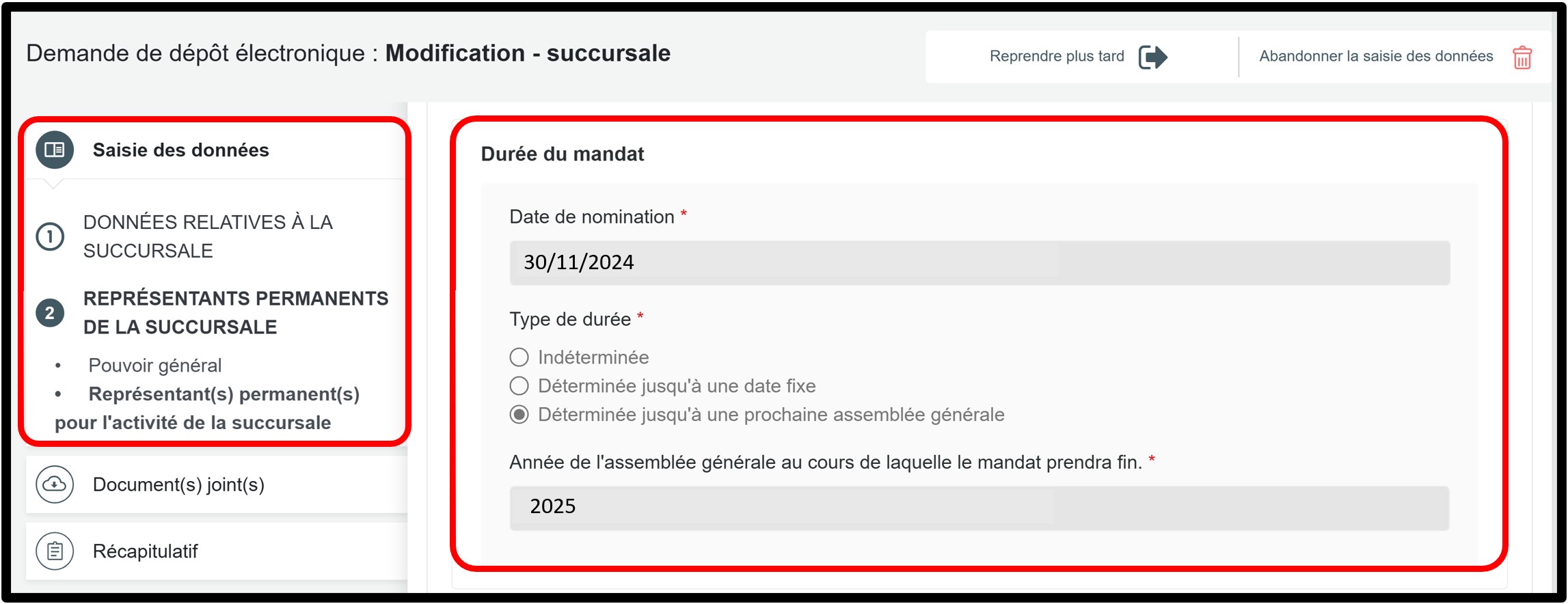 Dans la partie Saisie des données, sélectionnez la rubrique Représentants permanents de la succursale pour accéder aux informations à modifier.