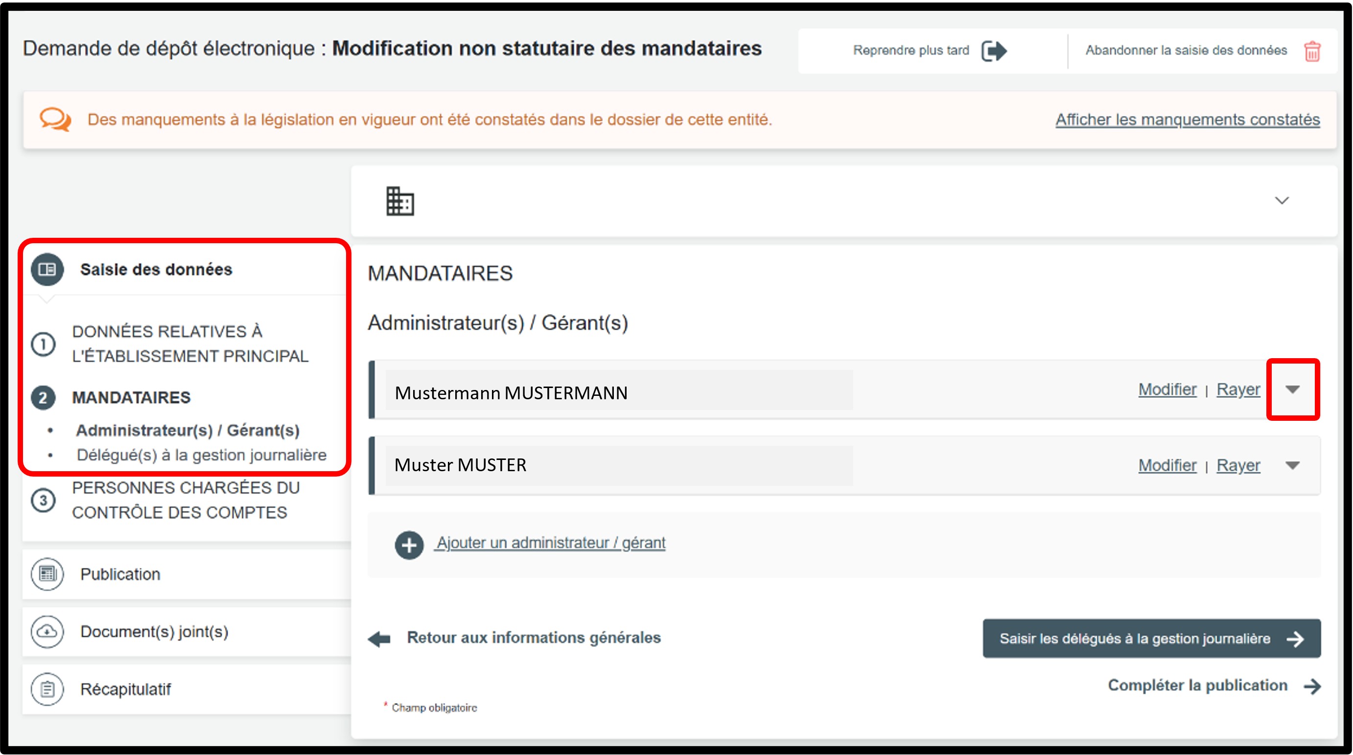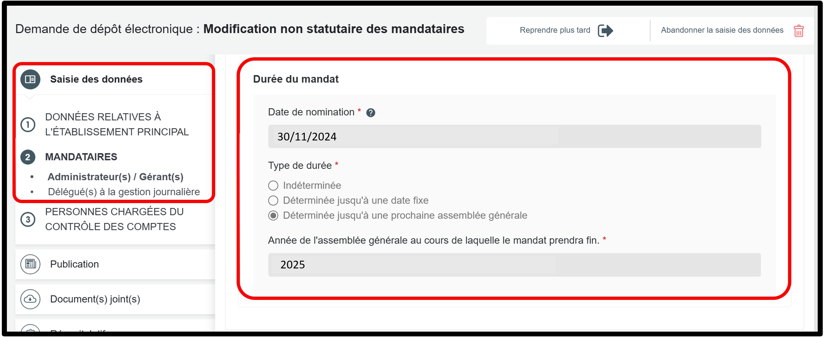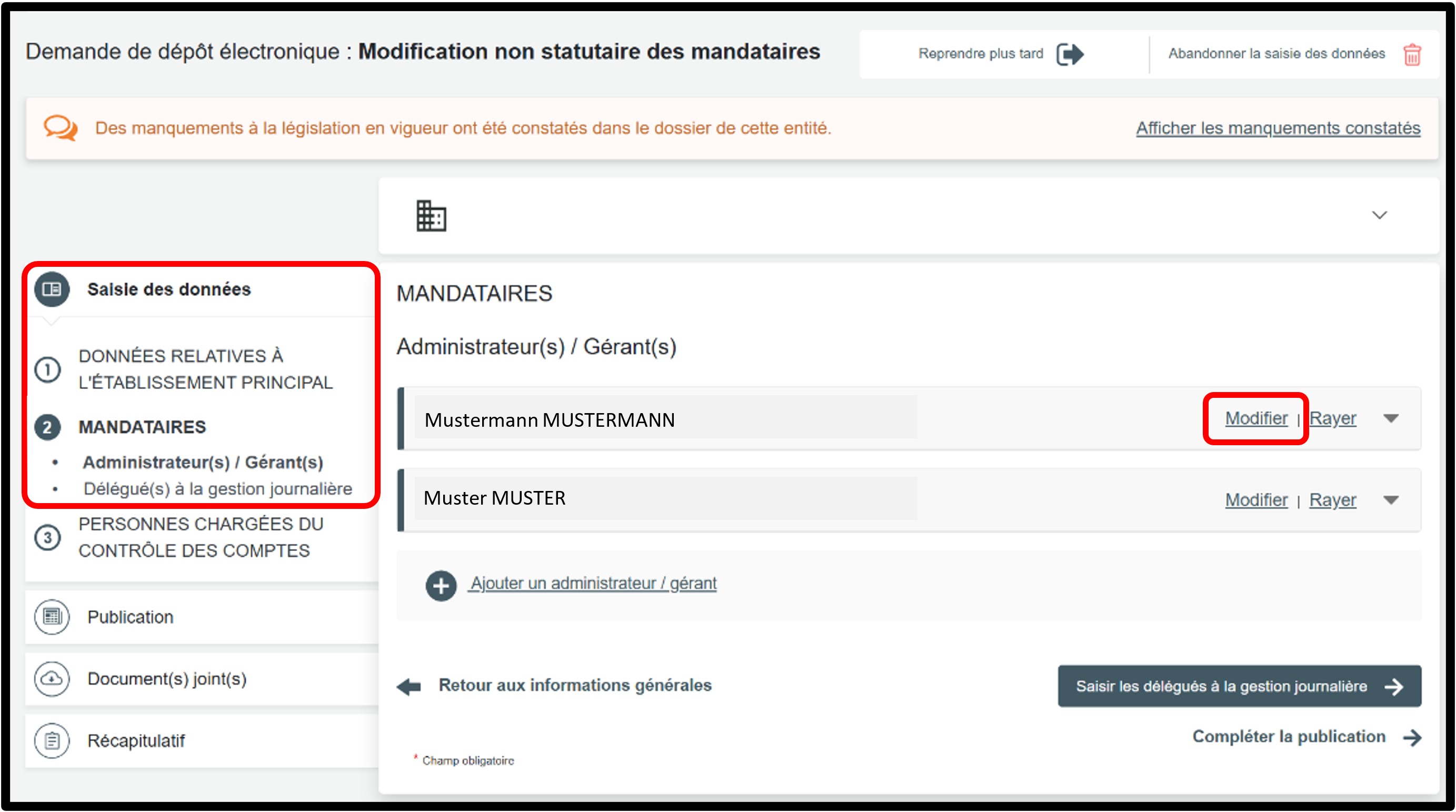Dans la partie Saisie des données, sélectionnez la rubrique Mandataires pour accéder aux informations à modifier.
