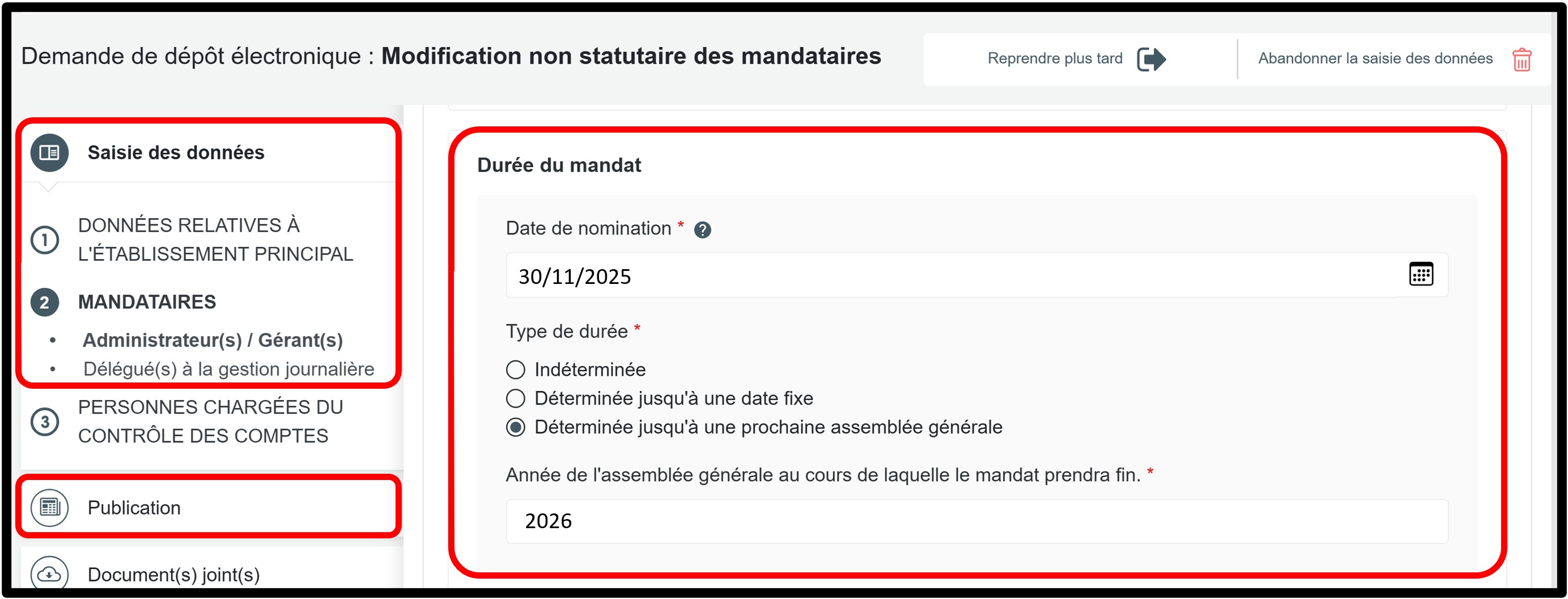 Si l’acte de nomination prévoit une durée précise, sélectionnez Déterminée jusqu’à une date fixe ou bien Déterminée jusqu’à une prochaine assemblée générale et indiquez la date de fin du mandat.