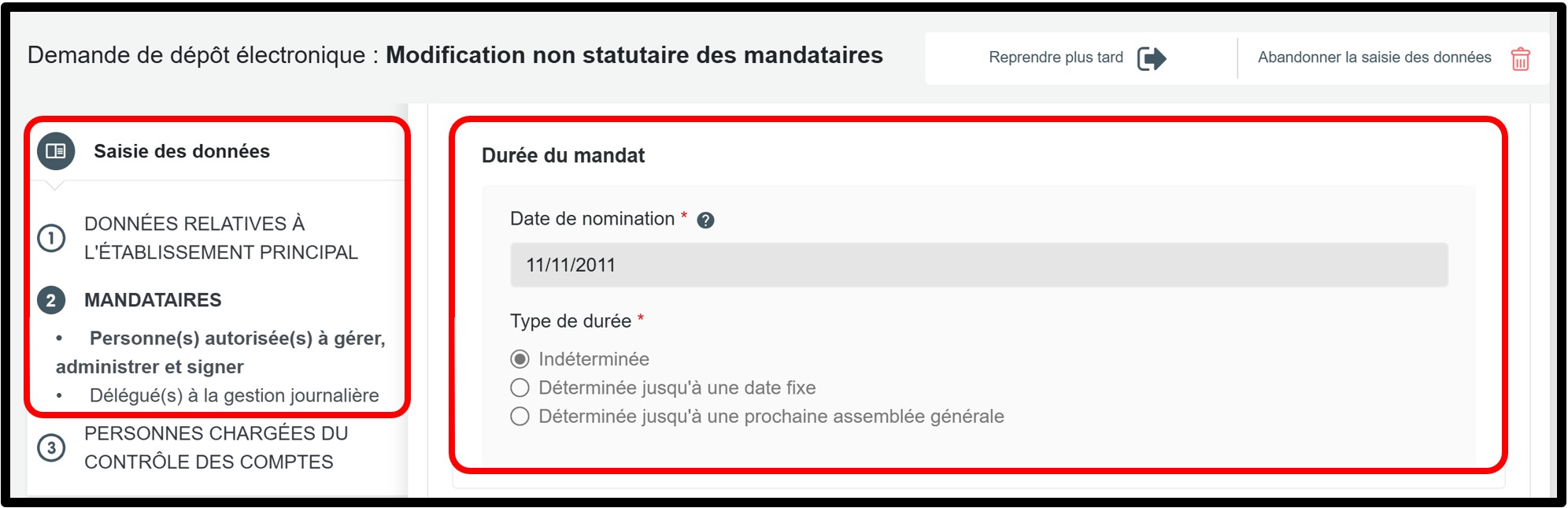 Dans l’exemple présenté, vous pouvez voir, dans la rubrique Durée du mandat, que la date de nomination est fixée en 2011.