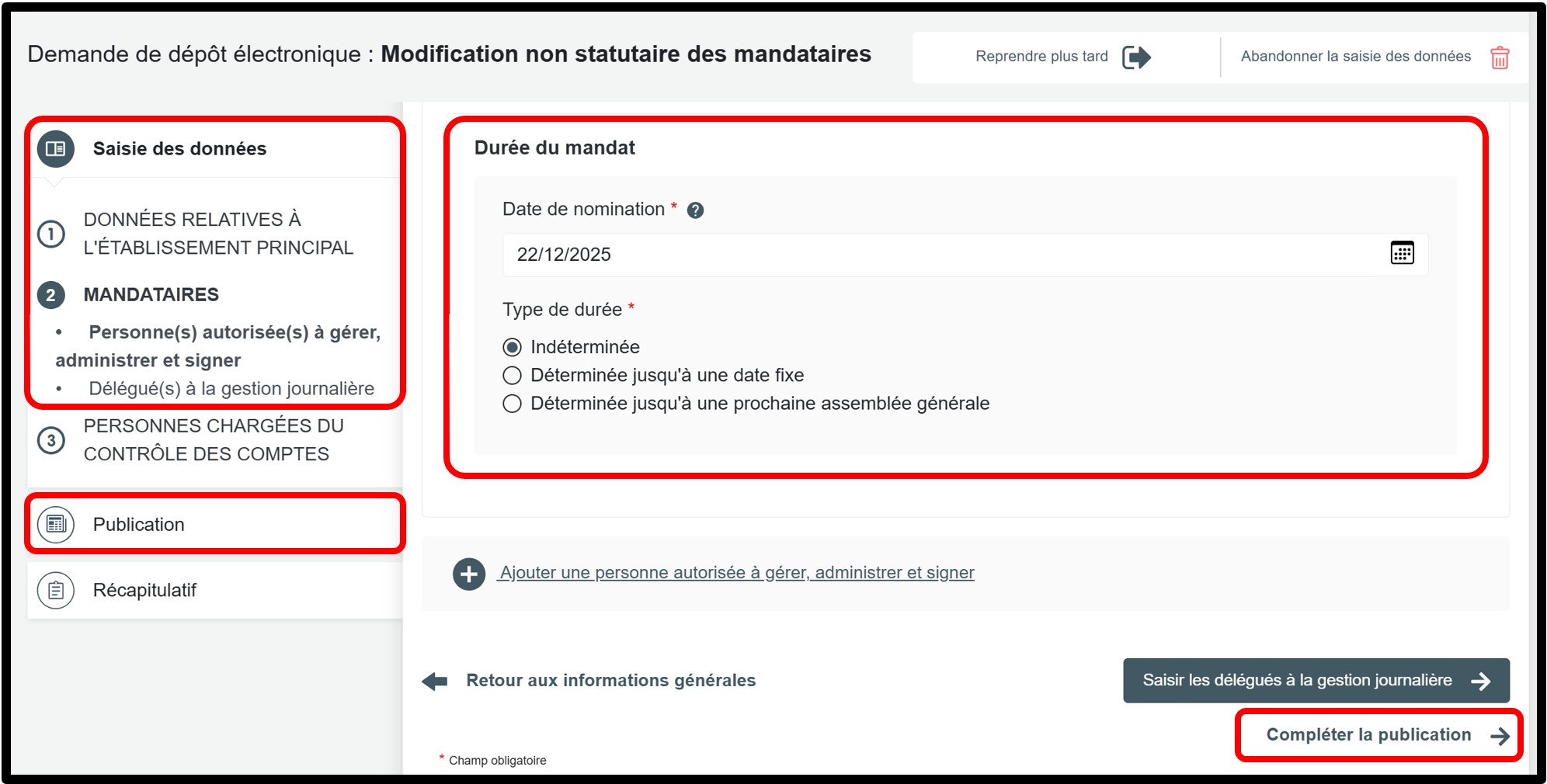 Si l’acte de nomination prévoit une durée précise, sélectionnez Déterminée jusqu’à une date fixe ou bien Déterminée jusqu’à une prochaine assemblée générale et indiquez la date de fin du mandat.