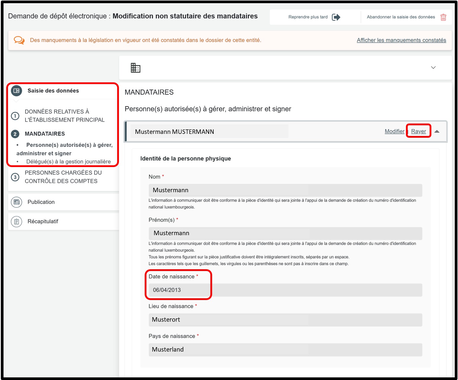 Dans la partie Saisie des données, sélectionnez la rubrique Mandataires pour accéder aux informations à modifier.