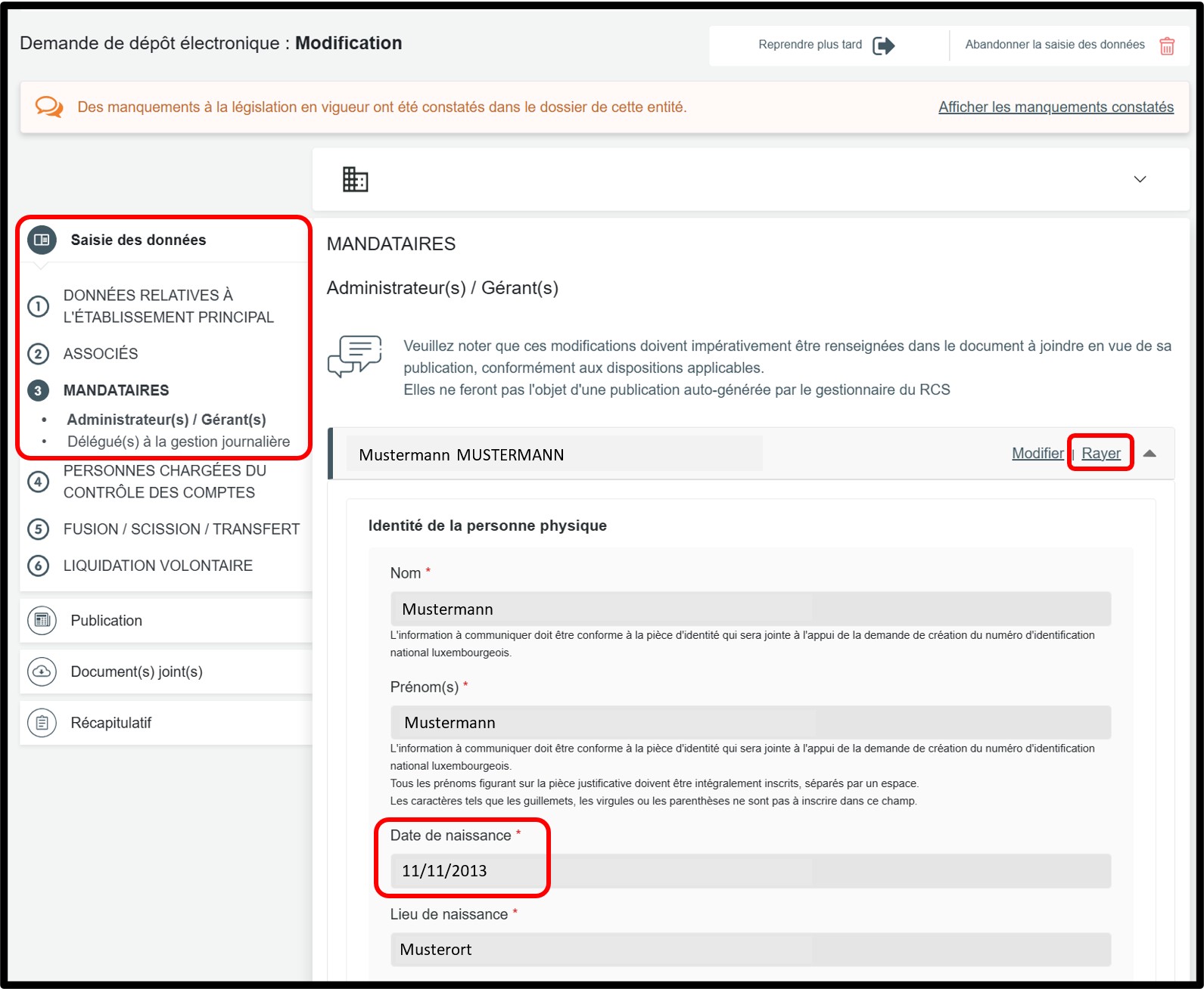 Dans la partie Saisie des données, sélectionnez la rubrique Mandataires pour accéder aux informations à modifier.