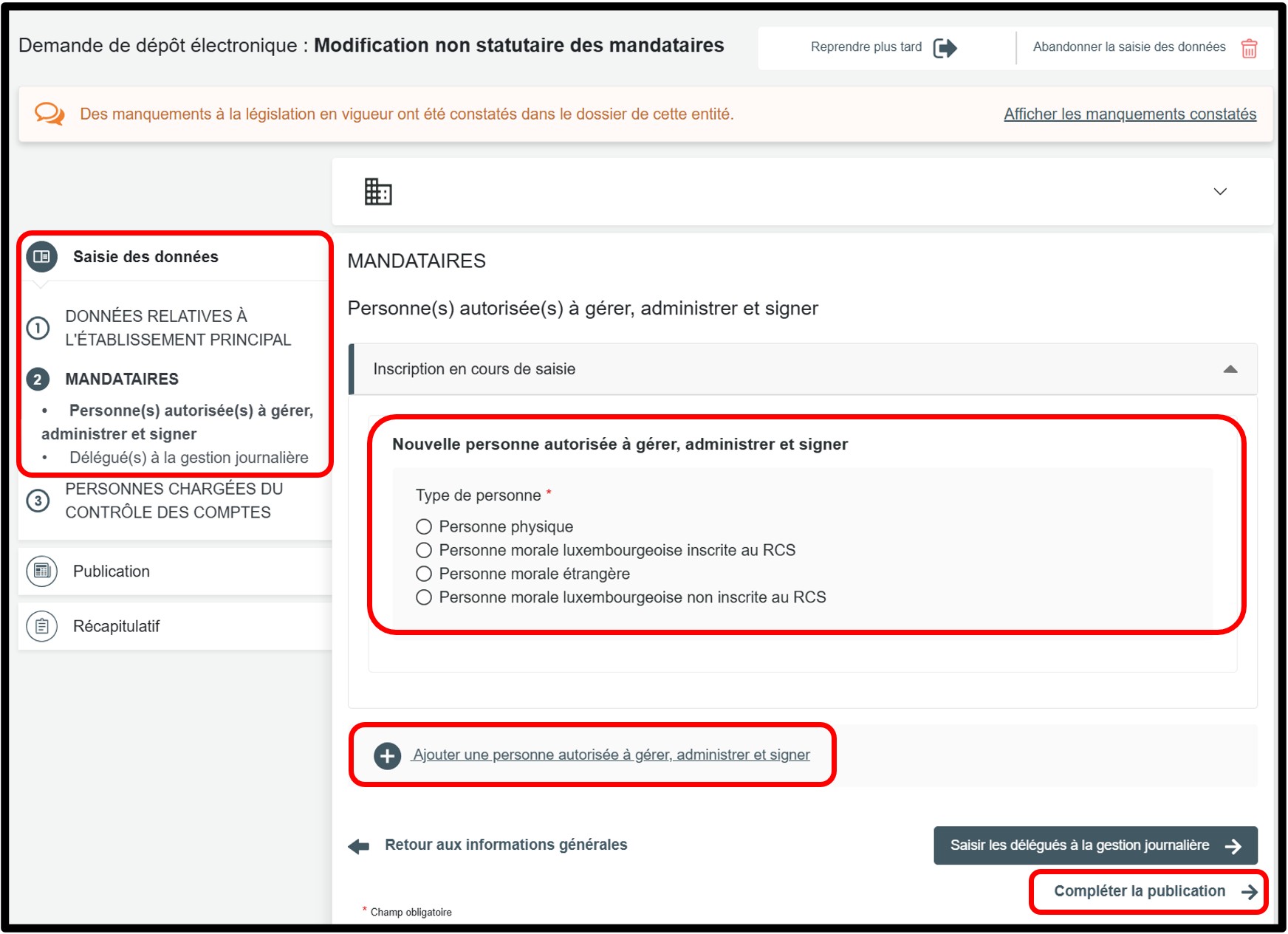 Selon le type de personne autorisée à gérer, administrer et signer, l'entité doit sélectionner parmi l'une des options suivantes et renseigner les informations correspondantes :