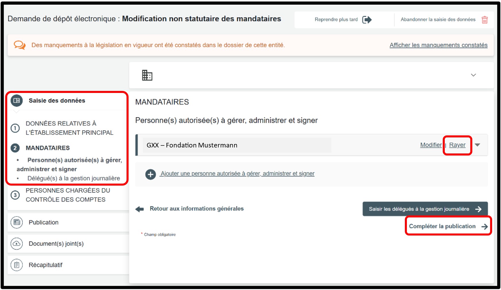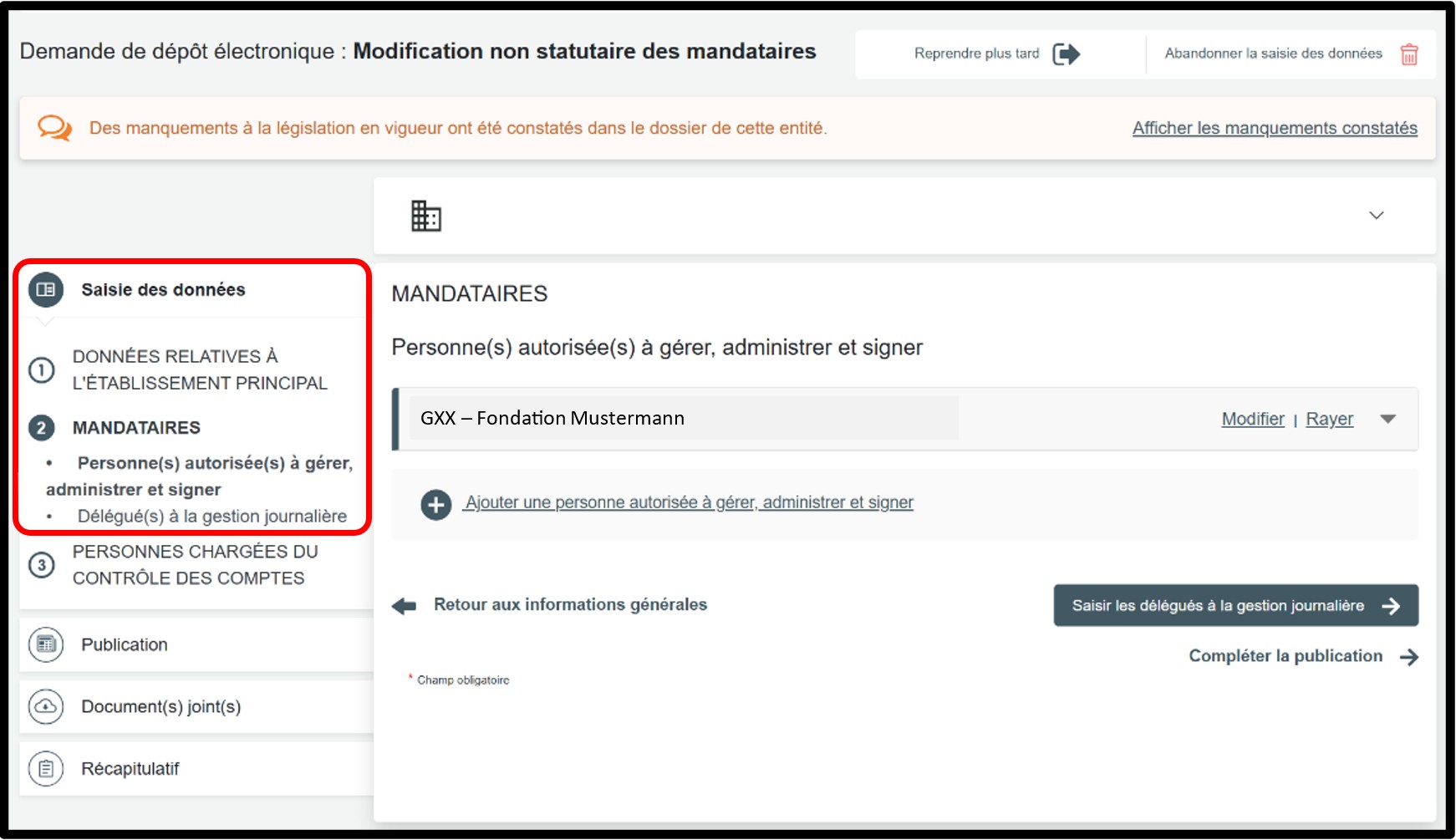 Dans la partie Saisie des données, sélectionnez la rubrique Mandataires pour accéder aux informations à modifier.