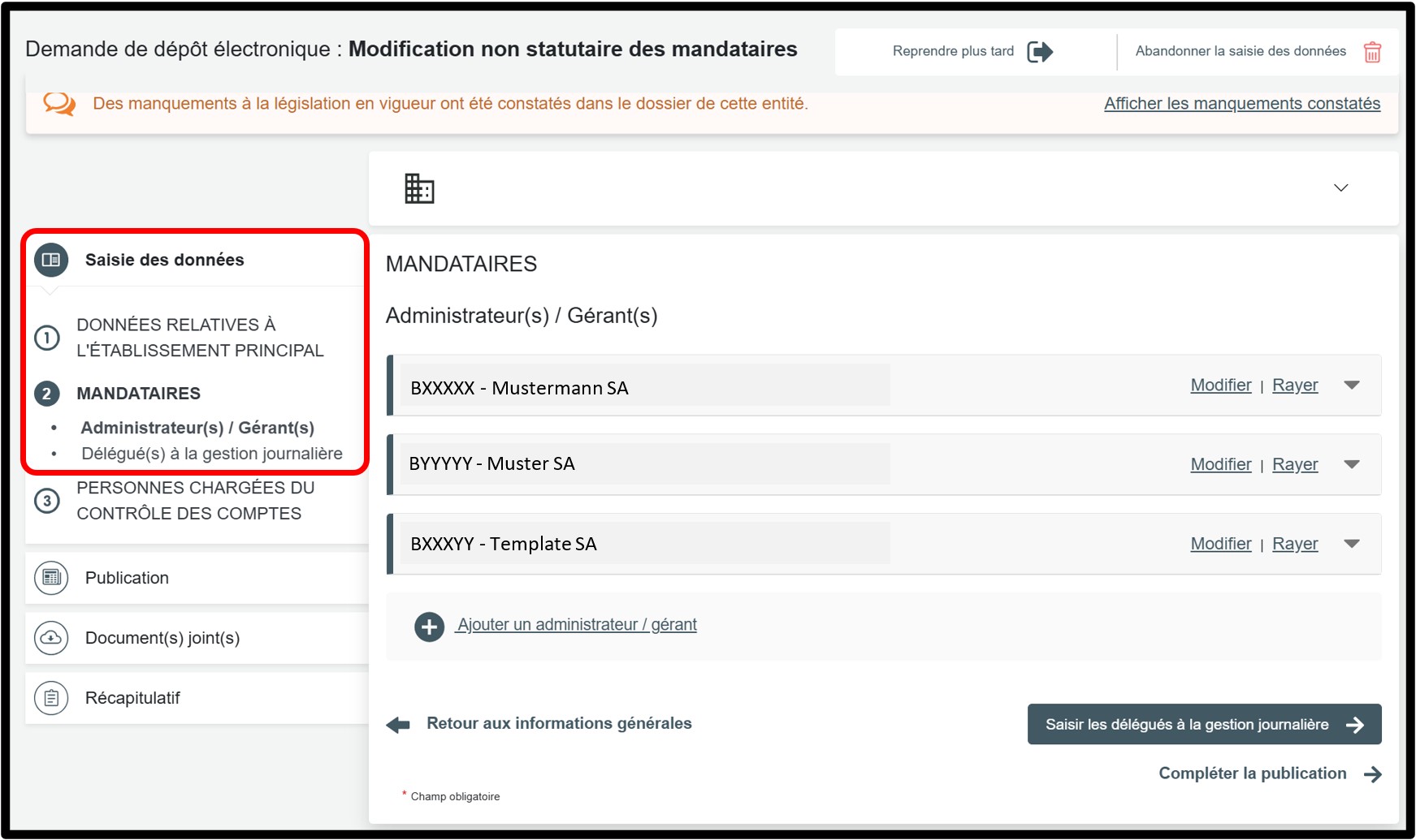 Dans la partie Saisie des données, sélectionnez la rubrique Mandataires pour accéder aux informations à modifier.