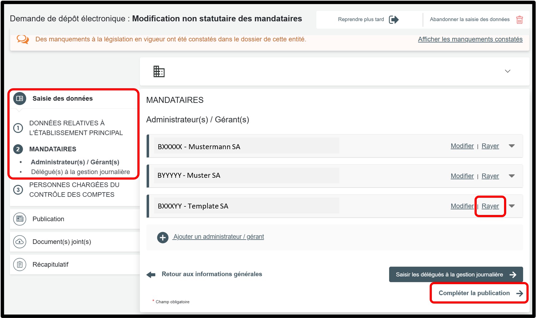 Une fois le mandataire personne morale identifié, dont le dossier RCS est radié, vous devez le supprimer de votre liste de mandataires en cliquant simplement sur l'option Rayer.