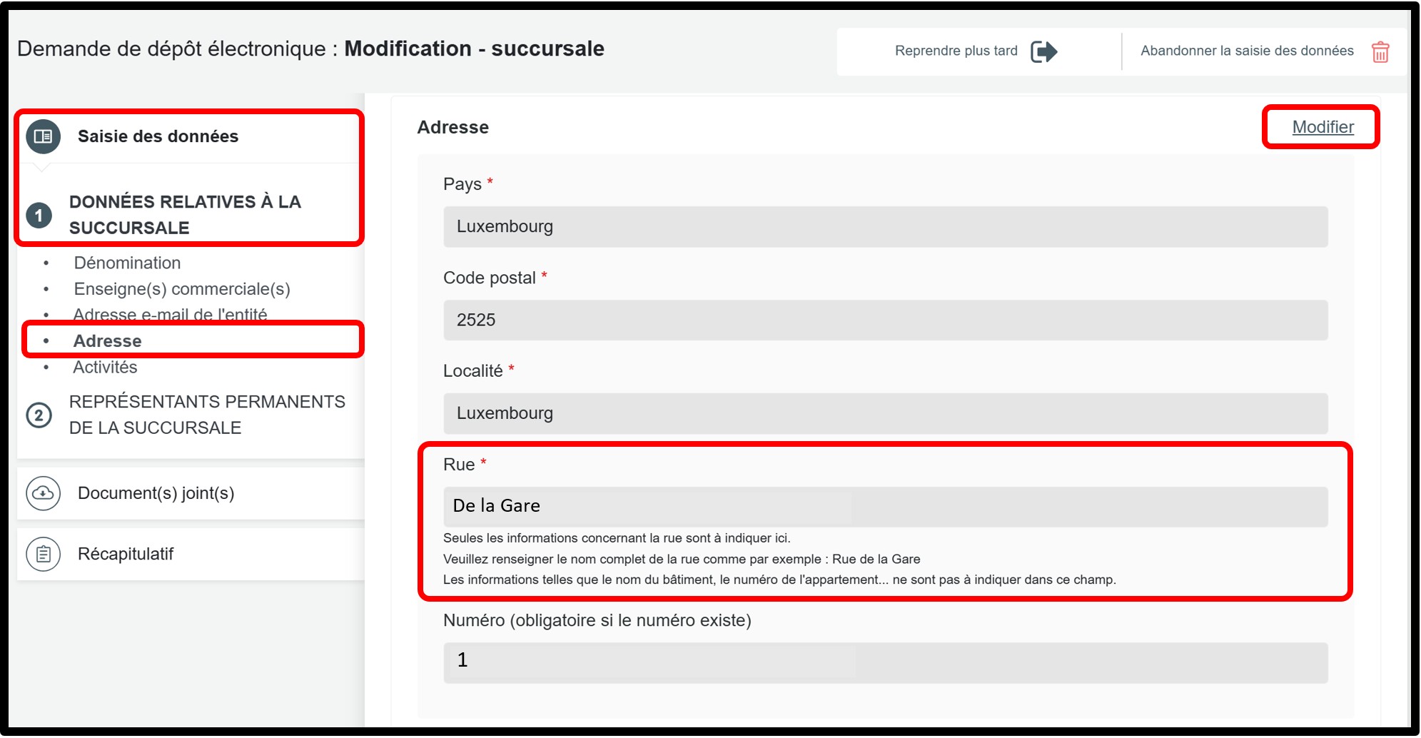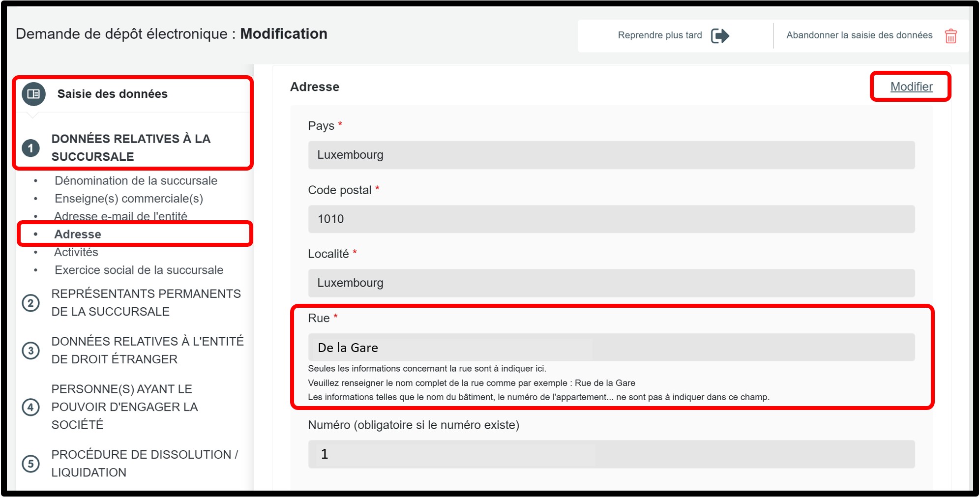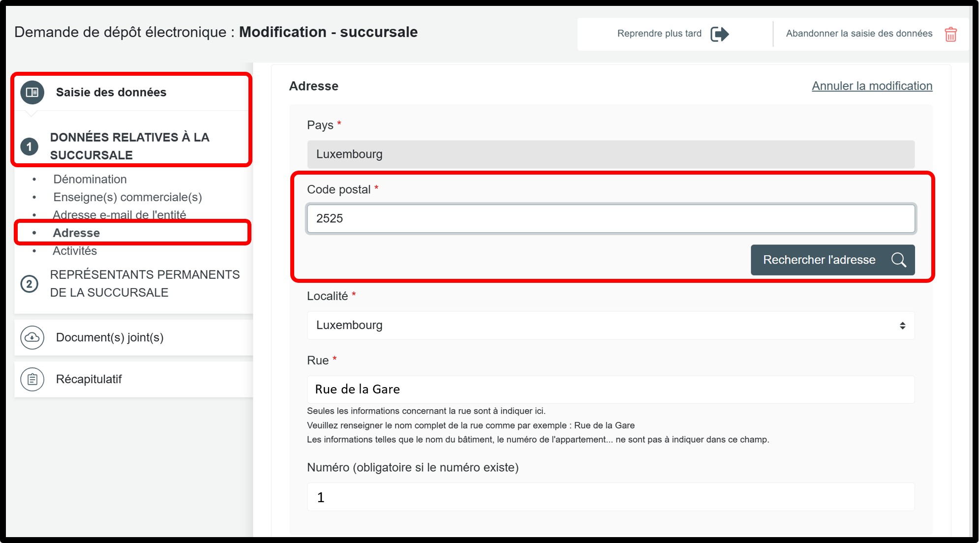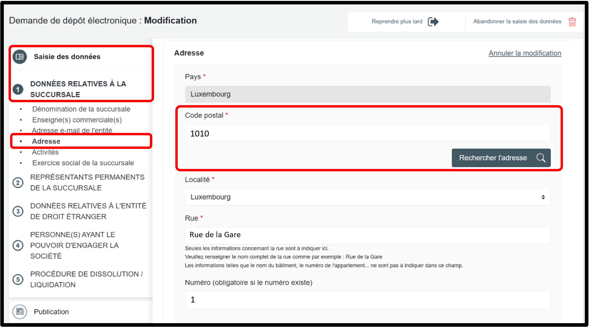 Cas de figure 2 : Mise à jour de l'adresse de la succursale d'une entreprise luxembourgeoise