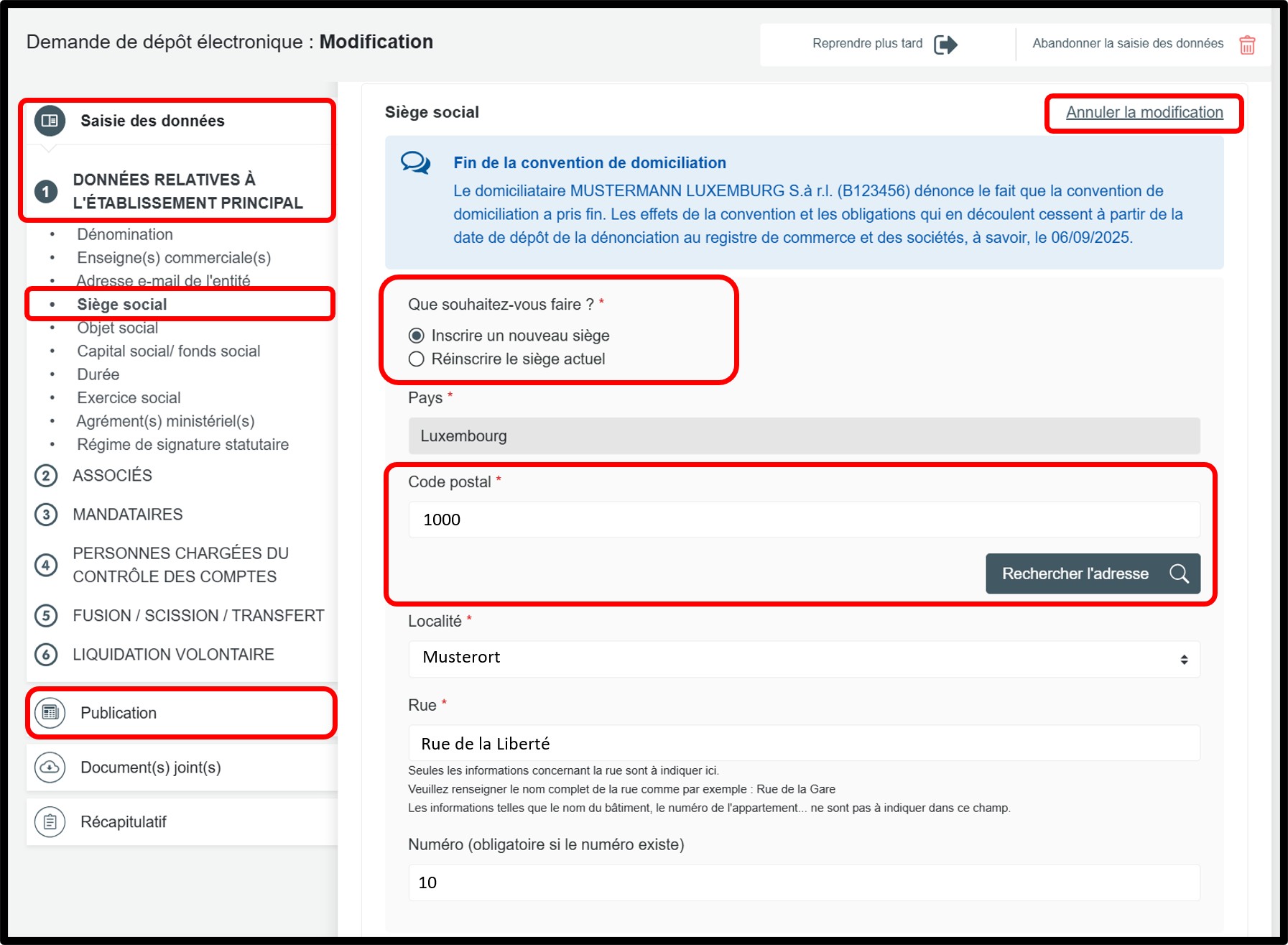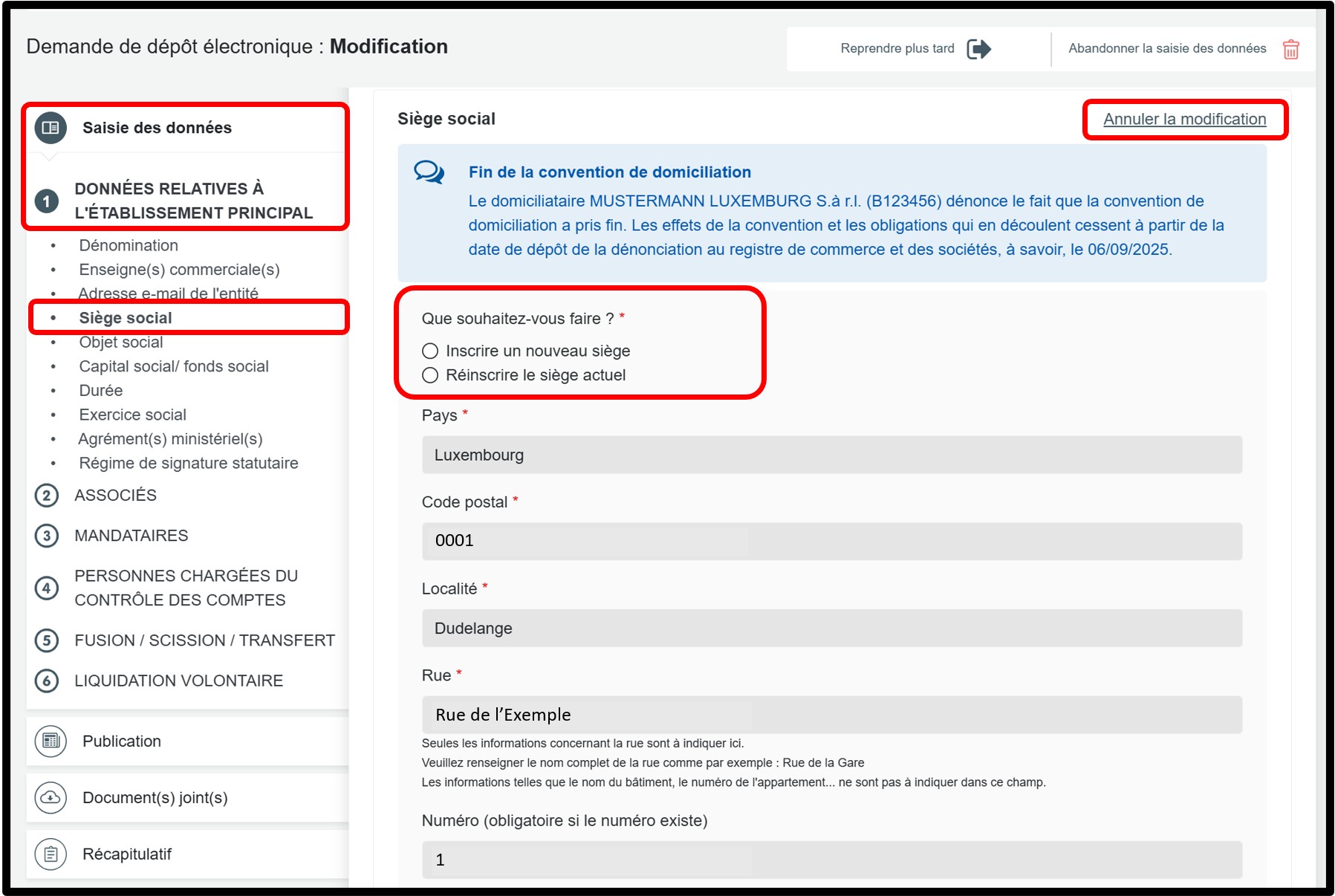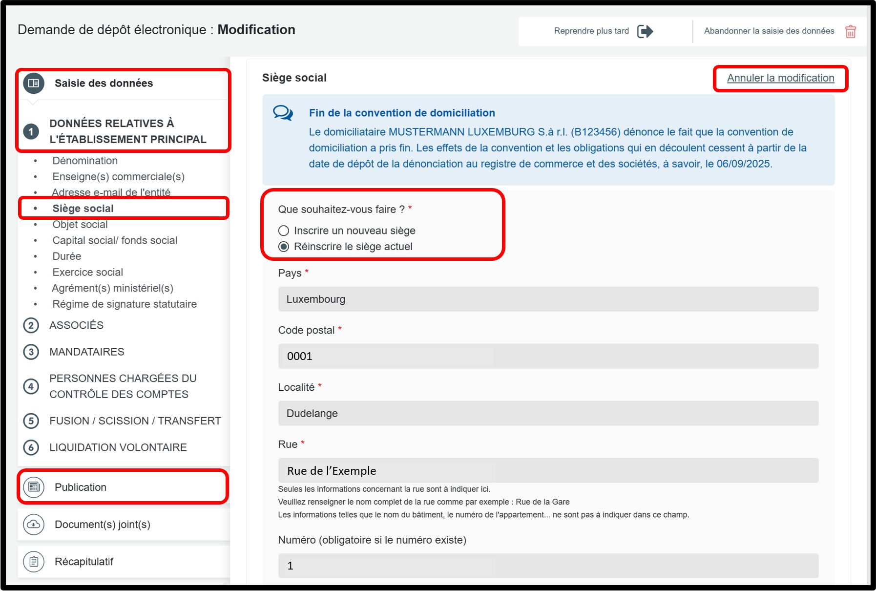 Si vous choisissez de réinscrire le siège actuel, les informations de l’ancien siège social s’affichent automatiquement à l’écran.