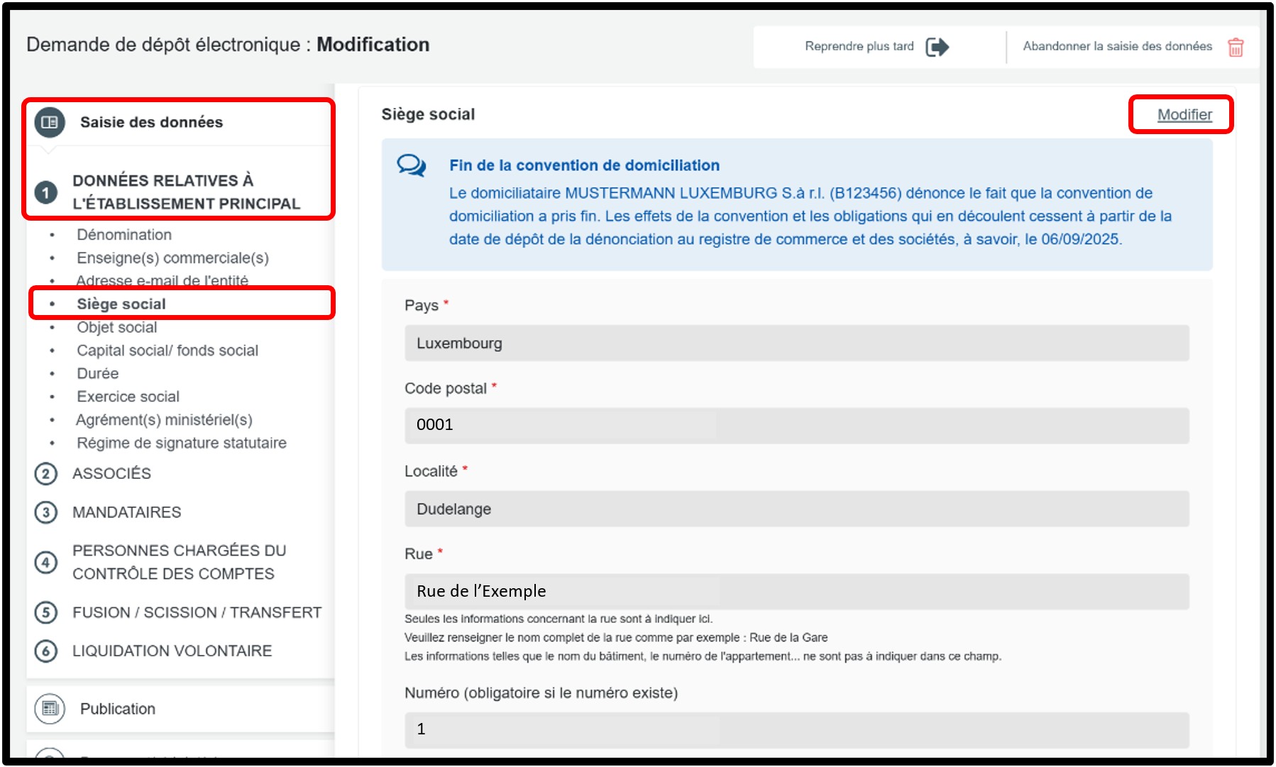 Dans la partie Saisie des données, sélectionnez la rubrique Siège social pour accéder aux informations à mettre à jour.